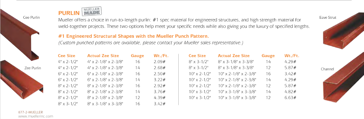 The roof purlins provide a surface to which the roof panels can be attached. Mueller offers you a choice in run-to-length purlin: #1 spec material for engineered structures, and high strength material for weld-together projects. These two options help meet your specific needs while also giving you the luxury of specified lengths. #1 Engineered Structural Shapes with the Mueller Punch Pattern. (Custom punched patterns are available, please contact your Mueller sales representative)